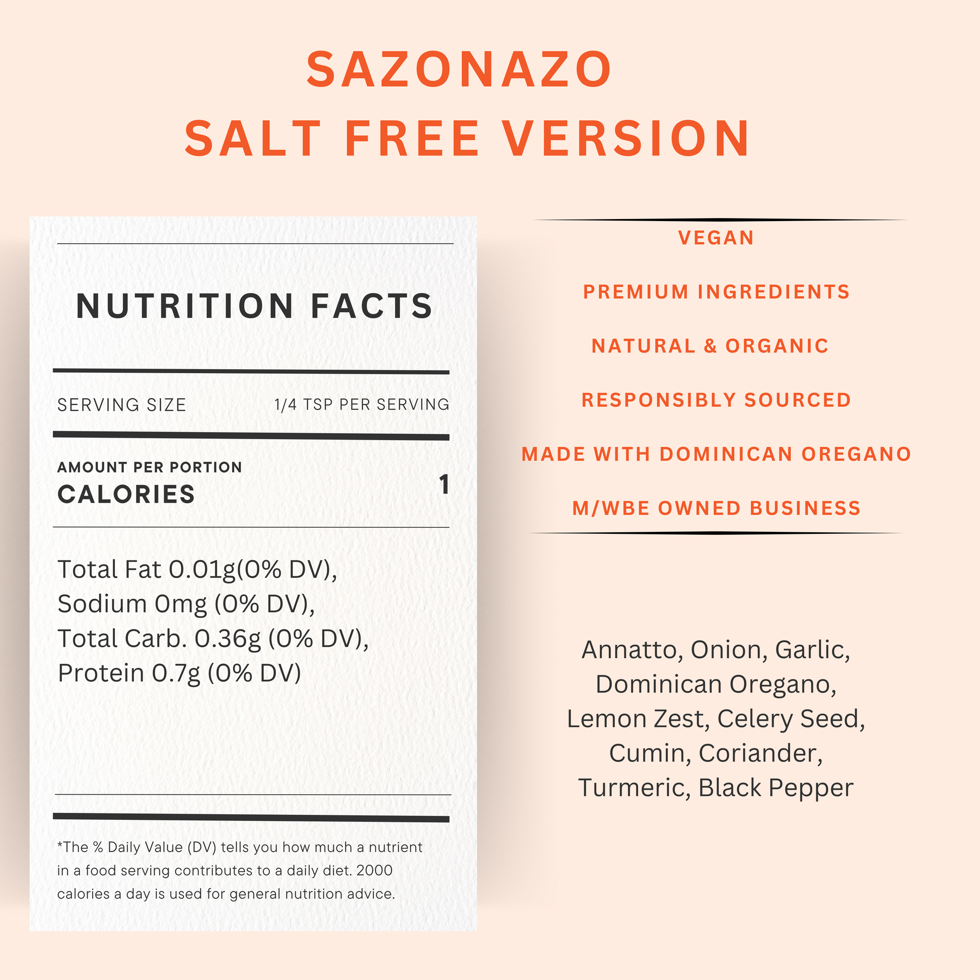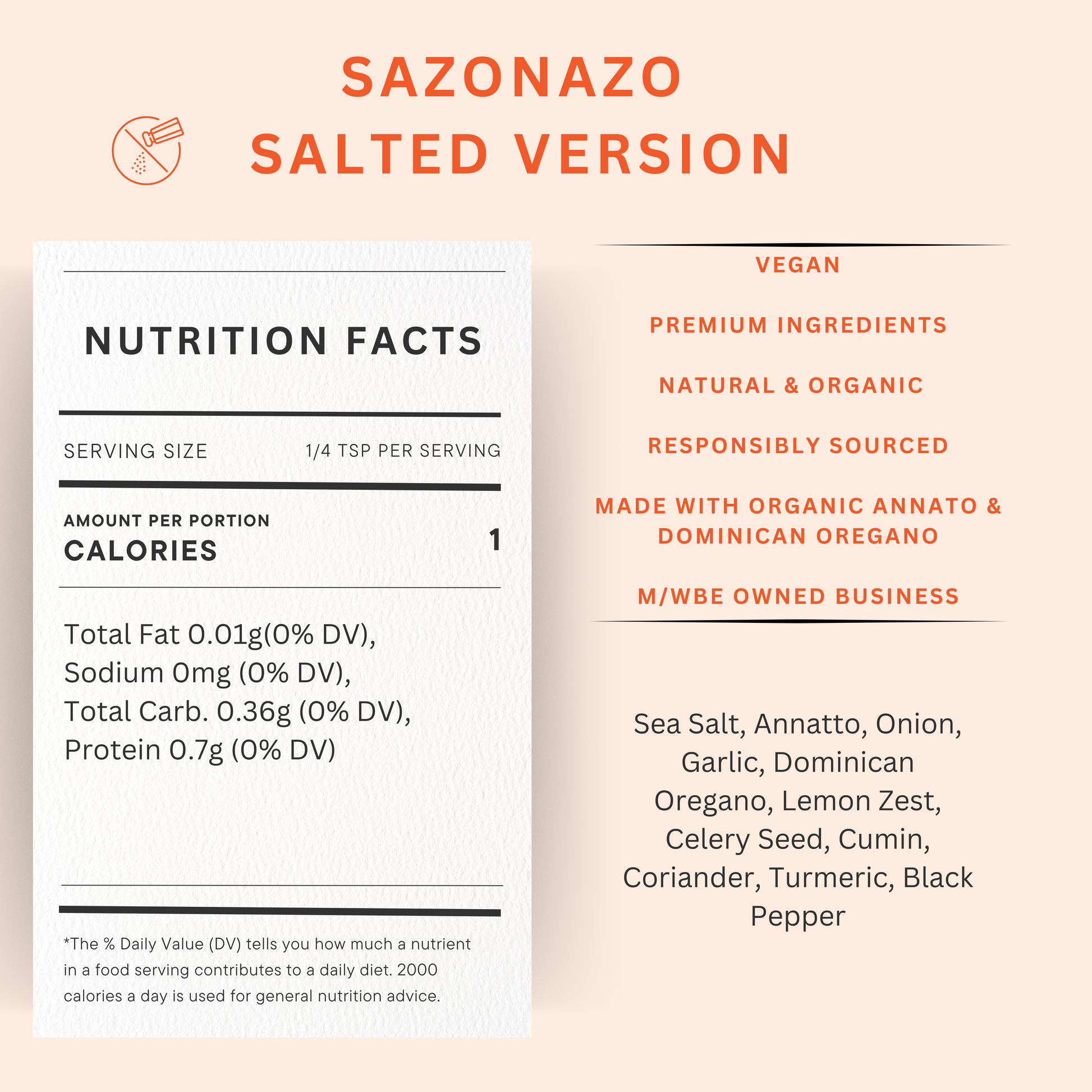Ingredients: Sea Salt, Achiote, Garlic, Onion, Sea Salt, Dominican Oregano, Turmeric, Celery Seed, Coriander, Lemon Peel